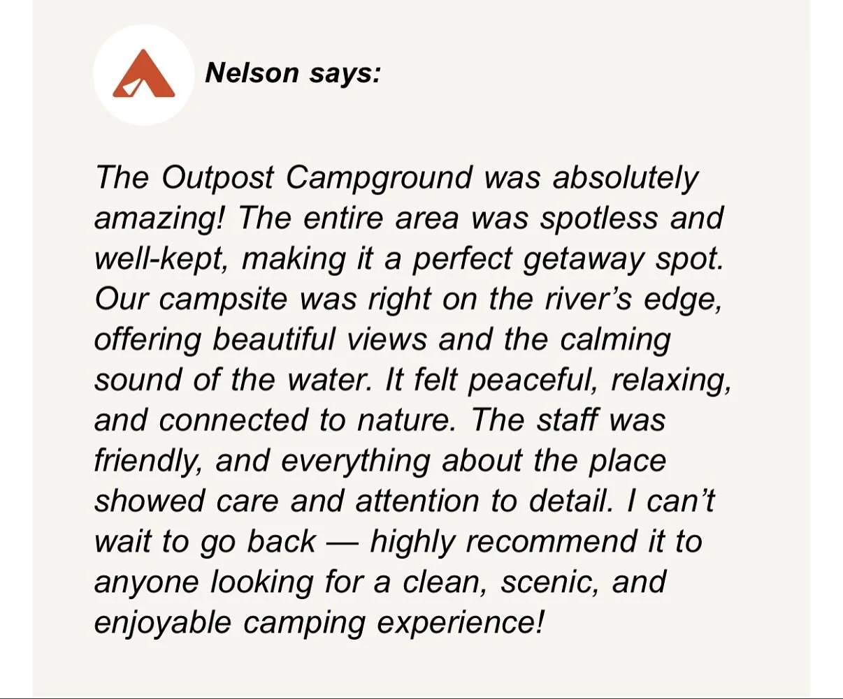Pull up to a Riverside RV site, featuring brand new 20/30/50 amp electric, water, and sewer hookups. Sites also include a fire ring, picnic table, garbage can, and parking. RVs up to 50’ in length.