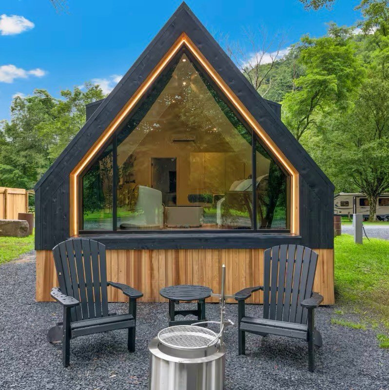 Perch on the mountain with clear views overlooking the woods and river. Space is temperature controlled, featuring large windows and a queen bed. Includes Adirondack chairs, a fire pit, picnic table, and parking.