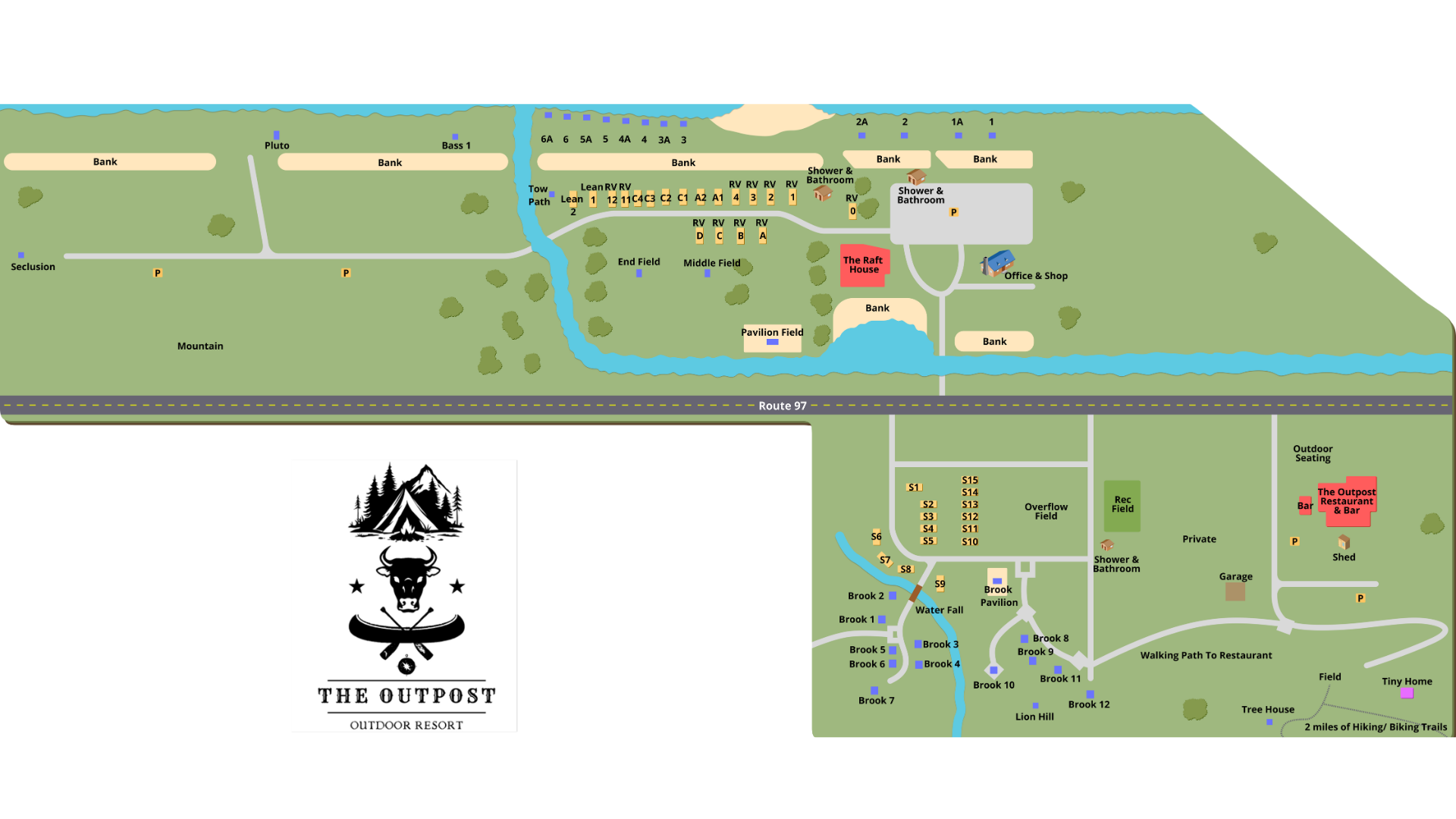 The Outpost Resort is located 16 miles north of Port Jervis along scenic Route 97 on the Delaware River in Pond Eddy, NY. Located within two hours of NYC, the drive is popular with motorcycle and car clubs, and passes through the unique lookout point Hawks Nest. The area swells in the spring, summer, and fall months with tourists, nature lovers, leaf peepers, campers, and rafters from around the country and globe. In the winter months, folks visit for the popular ski resorts and small town retreats in the Catskills.